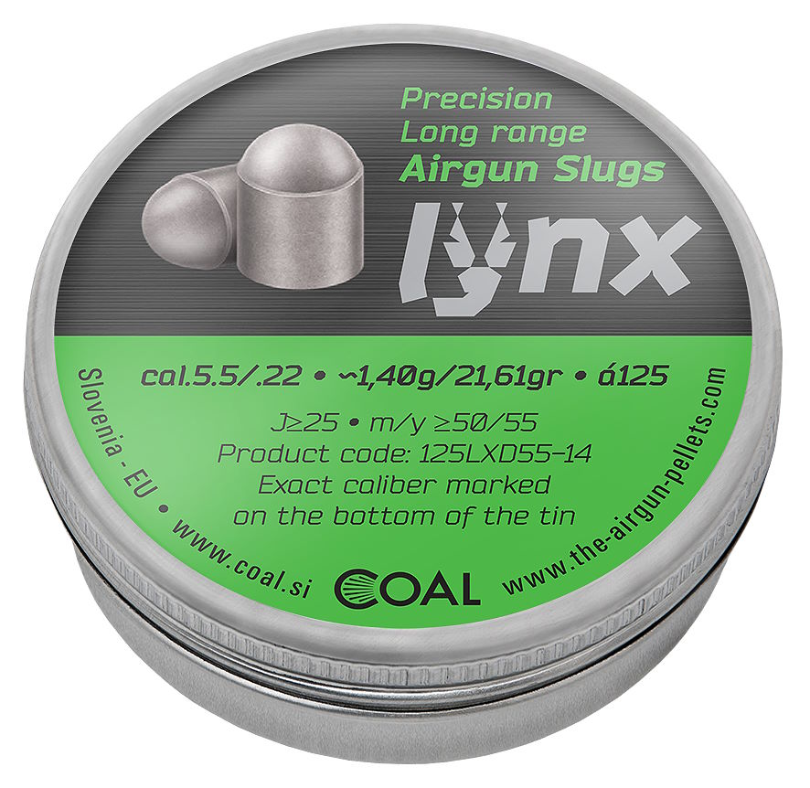 We offer the Lynx slugs in two different head shapes, domed and hollow point. They are designed for distances from 50 meters to 100 meters and beyond, and for muzzle energy of the rifle at least 25 joules and over. Aerodynamic design, as well as precise projectile weight constancy, which is +/- 0.004 gram or +/- 0.062 grain between projectiles, ensures excellent velocity constancy, projectile stability, accuracy and tightest impact groups. A great BC ensures a flat trajectory of projectile. The »Lynx« slugs are available in special calibers that can be fully customized to the barrel profile. A great novelity and advantage we offer to customers with »Lynx« slugs is that we can completely customize the weight of the projectile between 21,61 grains and 37.05 grains (between 1.4 grams and 2.4 grams) to the customer's wants and needs and choosing only from the predetermined factory weights of slugs that are produced will not be necessary anymore. Packaged in screw top tins and carefully packed in cartons to protect the slugs against damage.