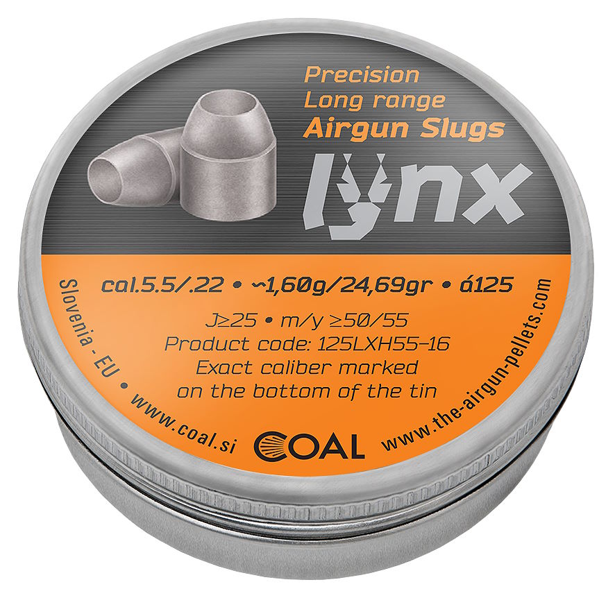 We offer the Lynx slugs in two different head shapes, domed and hollow point. They are designed for distances from 50 meters to 100 meters and beyond, and for muzzle energy of the rifle at least 25 joules and over. Aerodynamic design, as well as precise projectile weight constancy, which is +/- 0.004 gram or +/- 0.062 grain between projectiles, ensures excellent velocity constancy, projectile stability, accuracy and tightest impact groups. A great BC ensures a flat trajectory of projectile. The »Lynx« slugs are available in special calibers that can be fully customized to the barrel profile. A great novelity and advantage we offer to customers with »Lynx« slugs is that we can completely customize the weight of the projectile between 21,61 grains and 37.05 grains (between 1.4 grams and 2.4 grams) to the customer's wants and needs and choosing only from the predetermined factory weights of slugs that are produced will not be necessary anymore. Packaged in screw top tins and carefully packed in cartons to protect the slugs against damage.