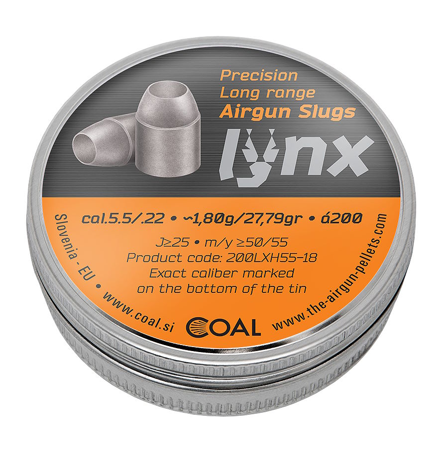 We offer the Lynx slugs in two different head shapes, domed and hollow point. They are designed for distances from 50 meters to 100 meters and beyond, and for muzzle energy of the rifle at least 25 joules and over. Aerodynamic design, as well as precise projectile weight constancy, which is +/- 0.004 gram or +/- 0.062 grain between projectiles, ensures excellent velocity constancy, projectile stability, accuracy and tightest impact groups. A great BC ensures a flat trajectory of projectile. The »Lynx« slugs are available in special calibers that can be fully customized to the barrel profile. A great novelity and advantage we offer to customers with »Lynx« slugs is that we can completely customize the weight of the projectile between 21,61 grains and 37.05 grains (between 1.4 grams and 2.4 grams) to the customer's wants and needs and choosing only from the predetermined factory weights of slugs that are produced will not be necessary anymore. Packaged in screw top tins and carefully packed in cartons to protect the slugs against damage.