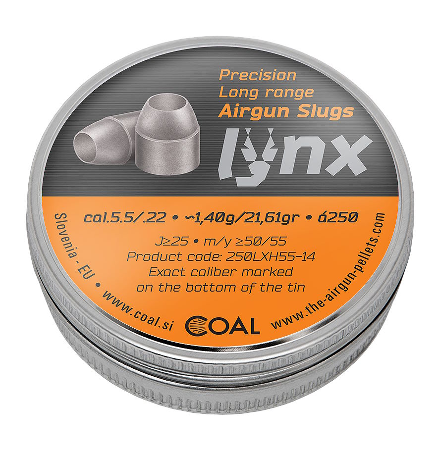 We offer the Lynx slugs in two different head shapes, domed and hollow point. They are designed for distances from 50 meters to 100 meters and beyond, and for muzzle energy of the rifle at least 25 joules and over. Aerodynamic design, as well as precise projectile weight constancy, which is +/- 0.004 gram or +/- 0.062 grain between projectiles, ensures excellent velocity constancy, projectile stability, accuracy and tightest impact groups. A great BC ensures a flat trajectory of projectile. The »Lynx« slugs are available in special calibers that can be fully customized to the barrel profile. A great novelity and advantage we offer to customers with »Lynx« slugs is that we can completely customize the weight of the projectile between 21,61 grains and 37.05 grains (between 1.4 grams and 2.4 grams) to the customer's wants and needs and choosing only from the predetermined factory weights of slugs that are produced will not be necessary anymore. Packaged in screw top tins and carefully packed in cartons to protect the slugs against damage.