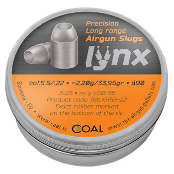 We offer the Lynx slugs in two different head shapes, domed and hollow point. They are designed for distances from 50 meters to 100 meters and beyond, and for muzzle energy of the rifle at least 25 joules and over. Aerodynamic design, as well as precise projectile weight constancy, which is +/- 0.004 gram or +/- 0.062 grain between projectiles, ensures excellent velocity constancy, projectile stability, accuracy and tightest impact groups. A great BC ensures a flat trajectory of projectile. The »Lynx« slugs are available in special calibers that can be fully customized to the barrel profile. A great novelity and advantage we offer to customers with »Lynx« slugs is that we can completely customize the weight of the projectile between 21,61 grains and 37.05 grains (between 1.4 grams and 2.4 grams) to the customer's wants and needs and choosing only from the predetermined factory weights of slugs that are produced will not be necessary anymore. Packaged in screw top tins and carefully packed in cartons to protect the slugs against damage.